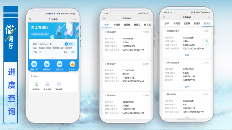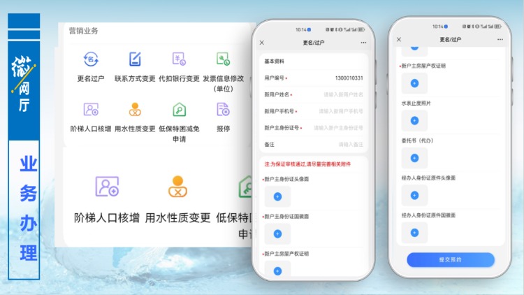 以更名過戶為例,用戶點(diǎn)擊更名過戶功能按鈕,進(jìn)入提交資料界面,按照頁(yè)面提示,填寫相關(guān)信息和拍照上傳附件,提交預(yù)約,后臺(tái)管理人員審核通過,便完成更名過戶辦理,用戶無需再到營(yíng)業(yè)大廳線下辦理任何手續(xù)。