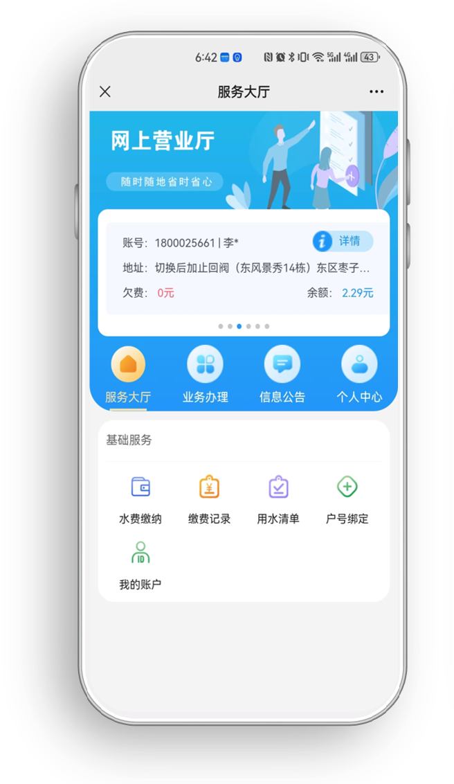 按照提示步驟,綁定用水開戶賬號(hào)后,就能輕松便捷使用“微網(wǎng)廳”各項(xiàng)服務(wù)功能。用水開戶賬號(hào)可查閱供水合同、服務(wù)短信或致電供水服務(wù)片區(qū)營(yíng)業(yè)服務(wù)熱線進(jìn)行查詢。
